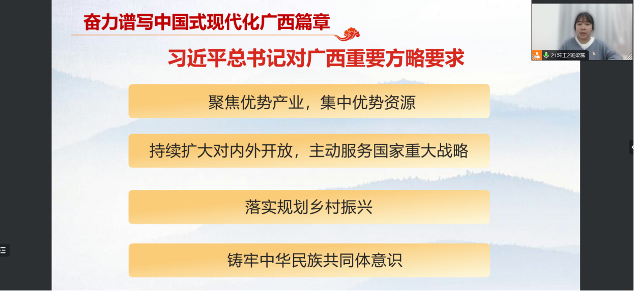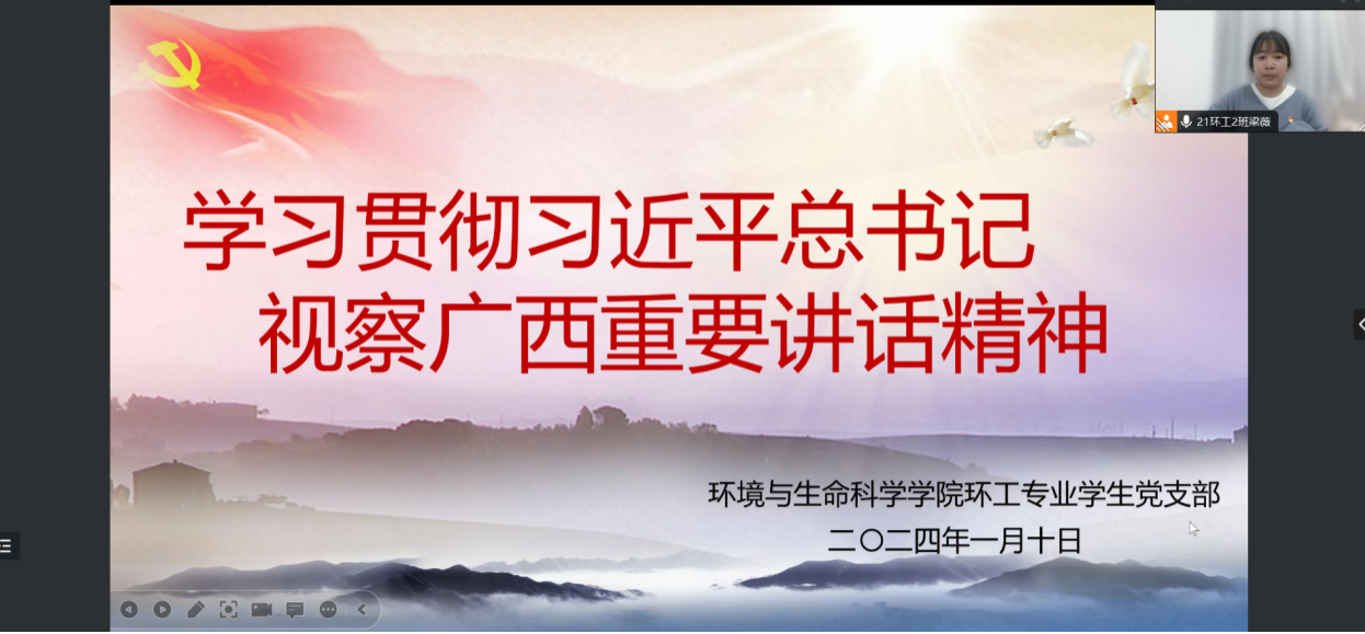 为深入学习贯彻习近平总书记视察广西重要讲话精神的意义,引导学生党员自觉把思想和行动统一到习近平总书记重要讲话精神上来,必赢766net手机版环工专业学生党支部于1月10日晚在腾讯会议开展“学习贯彻习近平总书记视察广西重要讲话精神”主题党课学习。参会人员有必赢766net手机版环工专业学生党支部书记曲炳鹏以及必赢766net手机版环工专业学生党支部全体党员。