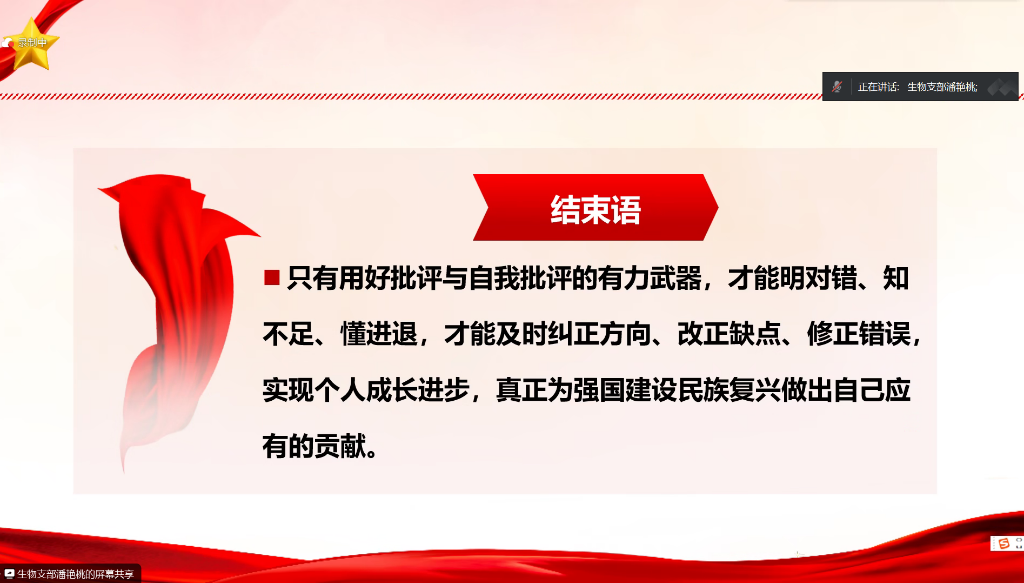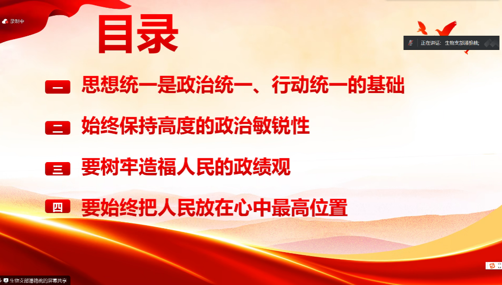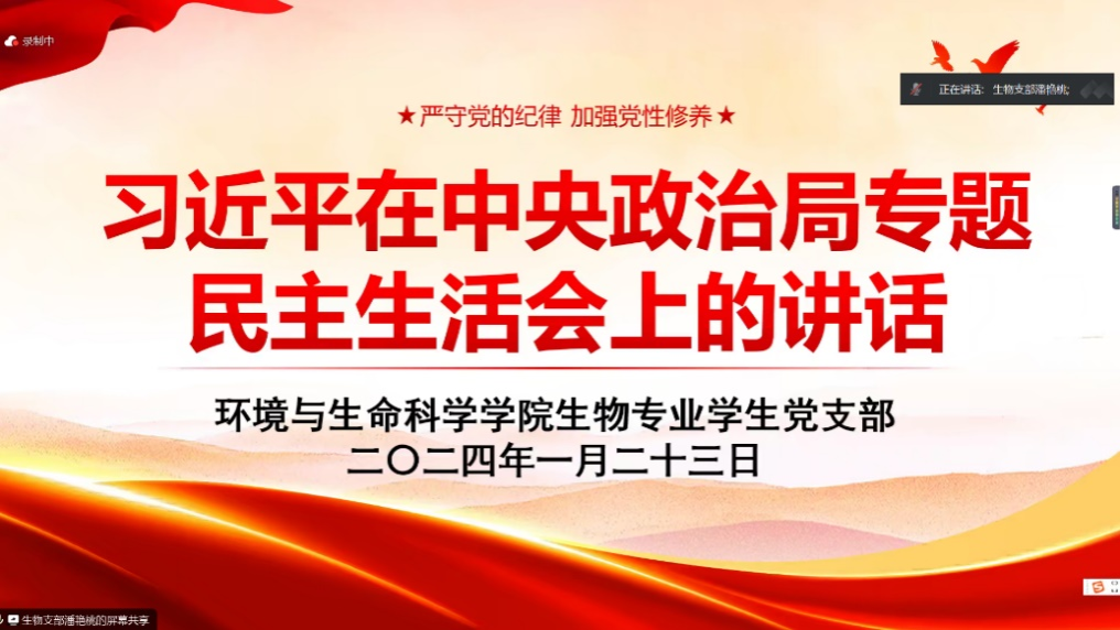为深入学习宣传贯彻习近平在中央政治局专题民主生活会上的讲话内容,必赢766net手机版生物专业学生党支部于1月23日19:30以线上会议的形式开展了“习近平在中央政治局专题民主生活会上的讲话”主题党课培训。本次会议参会人员为生物专业学生党支部全体党员,此次培训课程由党支部副书记潘艳桃主持。
