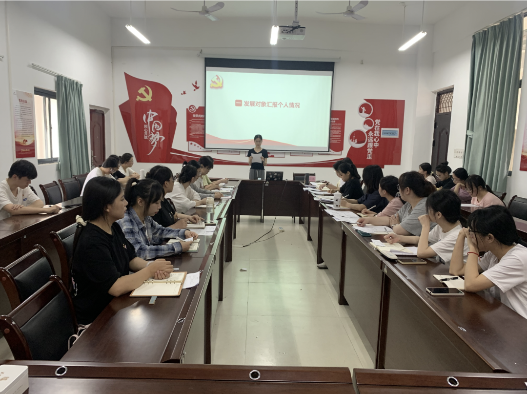 大会伊始,支部副书记陈秋灵介绍本次会议流程。本次会议主要有七项议程,首先,由发展对象进行汇报,主要从思想、学习和工作等方面的情况以及自身存在的不足进行汇报。然后,入党介绍人介绍发展对象平时表现并对其能否加入中国共产党发表意见,由支部委员会汇报政审情况,与会党员讨论并向发展对象提出建议。其次,由发展对象进行表态。最后,与会正式党员采取无记名的投票方式进行表决,投票结果当众宣读,最终结果为同意接收马舒程等5名同志为中共预备党员。
