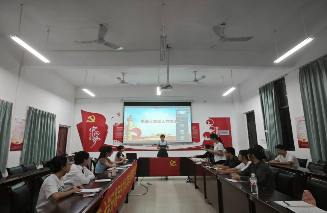 本次会议由支部书记潘艳桃主持。会议严格按照党组织接收预备党员的程序进行。首先由7名发展对象分别宣读入党志愿书;接着入党介绍人介绍发展对象有关情况并发表意见、与会党员对发展对象发表意见或建议、发展对象对党员的意见或建议进行回应,同时表明自己的入党决心;最后,在场有表决权的党员同志对发展对象进行了无记名投票表决。