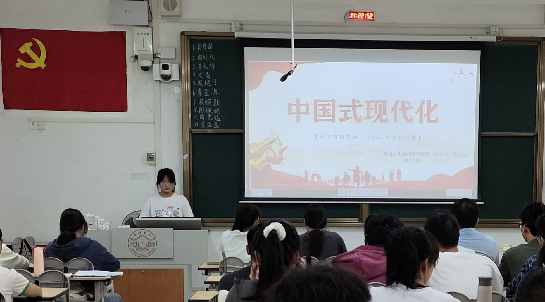 为深入学习贯彻党的二十届三中全会精神,增强党员同志对党的先进理论和方针政策的进一步学习、理解,引导广大党员深入理解和践行中国式现代化的重要思想,必赢766net手机版环工专业学生党支部于11月19日下午在武鸣校区1号教学楼120教室开展“中国式现代化”主题党课学习。参会人员有必赢766net手机版环工专业学生党支部书记曲炳鹏以及该党支部全体党员。