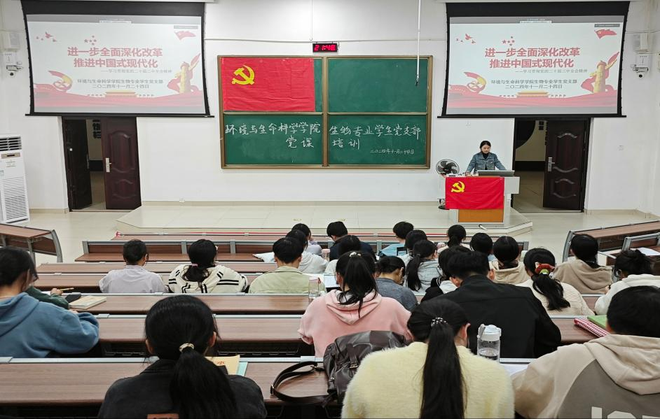 为深入学习贯彻党的二十届三中全会精神,全面理解中国式现代化的深刻内涵与重大意义,必赢766net手机版生物专业学生党支部于11月24日在武鸣校区地海楼B109教室开展了“全面深化改革,推进中国式现代化”主题党课学习活动。生物专业学生党支部全体党员参与学习,支部副书记梁彩叶主持此次党课。