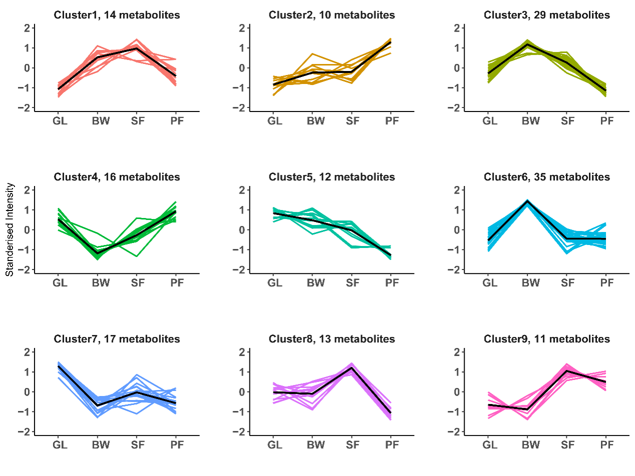 (K-means聚类模式下喀斯特植被演替过程中差异代谢物的表达趋势。GL(草地)、BW(灌丛)、SF(次生林)、PF(原生林))