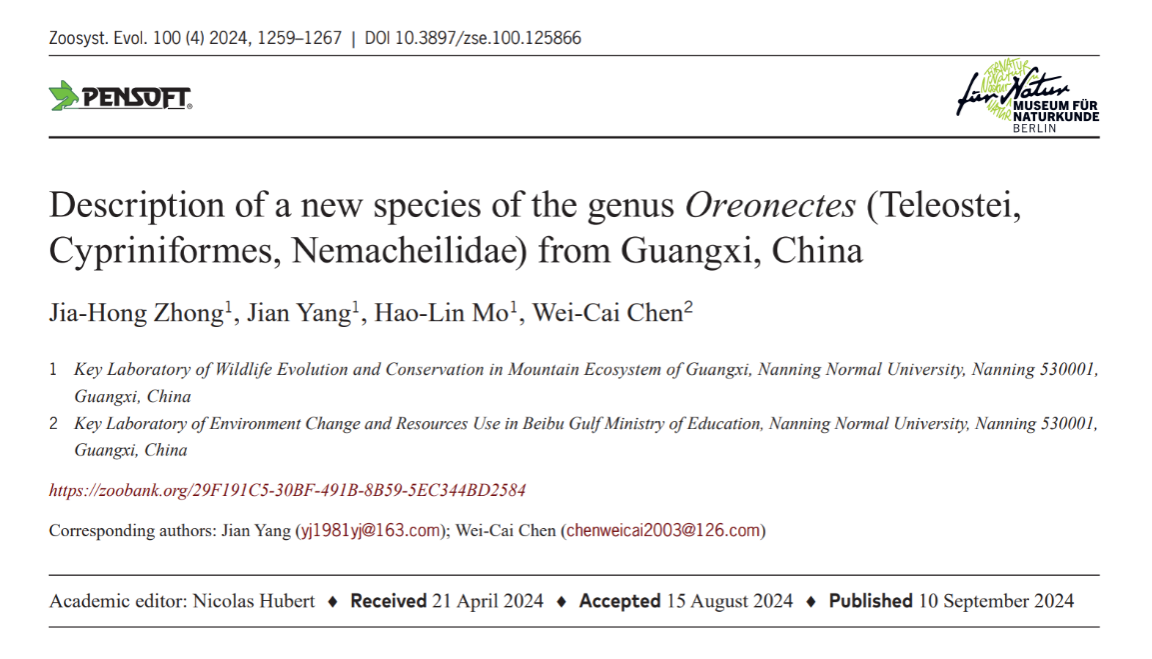 近日,我院2021级生物科学专业本科生钟佳宏同学(第一作者)在SCI期刊《Zoosystematics and Evolution》(影响因子1.6,JCRQ2,中科院二区)上发表了题目为《Description of a new species of the genusOreonectes(Teleostei, Cypriniformes, Nemacheilidae) from Guangxi, China》的研究论文。2021级生物科学专业莫昊霖同学为本文共同作者。该论文在我院杨剑老师和本校地理与海洋研究院陈伟才老师共同指导下完成。