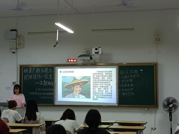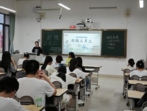 此次班会以PPT的形式,图片和文字相结合,提高了主题班会的视觉吸引力,引起了同学们的兴趣。同时可以展示丰富的信息,包括文字、图片、视频等,使主题班会的内容更为丰富。让同学们了解到了三月三的由来、风俗以及壮族的服饰等。除此之外,还通过播放广西山歌,来让同学们感受广西山歌的魅力。
