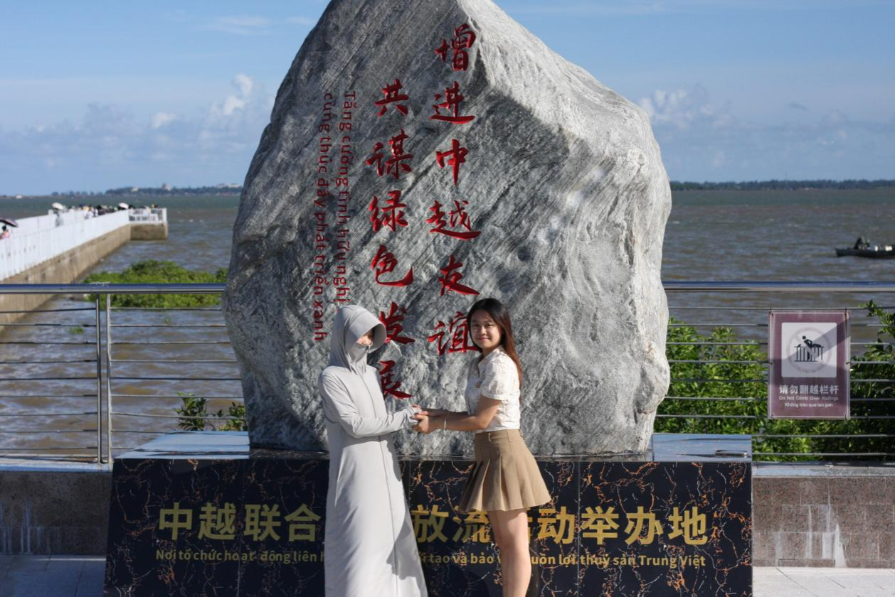 下午,师生们接着抵达东兴市江平镇的沙虫寮。在这里大家齐心协力,充分发挥团队的力量捕捉湿地昆虫。在陈梅兰老师的演示下,同学们掌握了捕虫网、三角带等捕虫工具的使用方法,捕捉到了多种多样的昆虫。张鹏飞老师发现了一只中华鲎的蜕壳,他向同学们讲解了中华鲎的生活史及保护地位、使用价值。随后,师生们抵达大清国一号界碑景区。同学们参观了中越联合增殖放流活动举办地及大清国钦州界碑,加深了对中越两国之间的外交以及古代地理分布的认识。