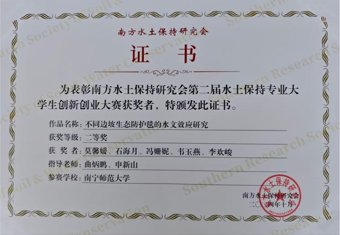 10月27日,南方水土保持研究会第二届水土保持专业大学生创新创业大赛颁奖仪式在重庆西南大学举行。由我校必赢766net手机版曲炳鹏教师团队指导,莫馨媛、石海月、冯姗妮、韦玉燕、李欢峻同学共同完成的参赛作品《不同边坡生态防护毯的水文效应研究》荣获研究生组二等奖。