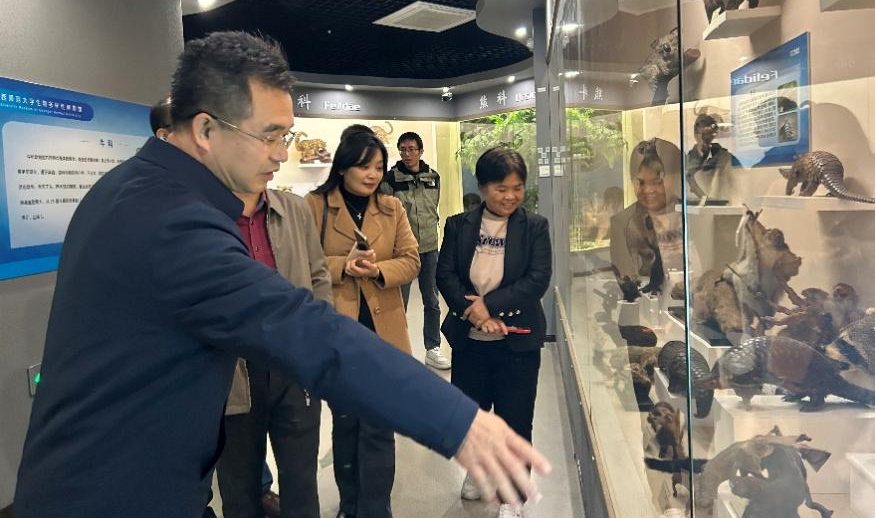 12月6日上午,调研组前往广西师范大学生命科学学院开展交流学习。该院武正军院长概述了生命科学学院的发展历程、团队建设、实验室建设和成果产出等情况。双方还围绕党建工作、学科发展、创新创业、绩效改革等问题进行了深入的探讨和交流。会后,调研组参观了广西师范大学生物多样性博物馆,学习了科普基地的建设经验和成果。