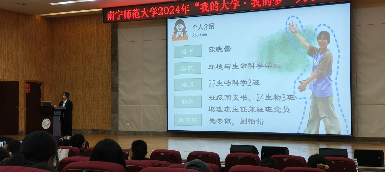 12月17日下午,我院学生代表欧晓蕾在我校武鸣校区图书馆报告厅参加“我的大学·我的梦”大学生先进事迹报告会,并作主题分享。