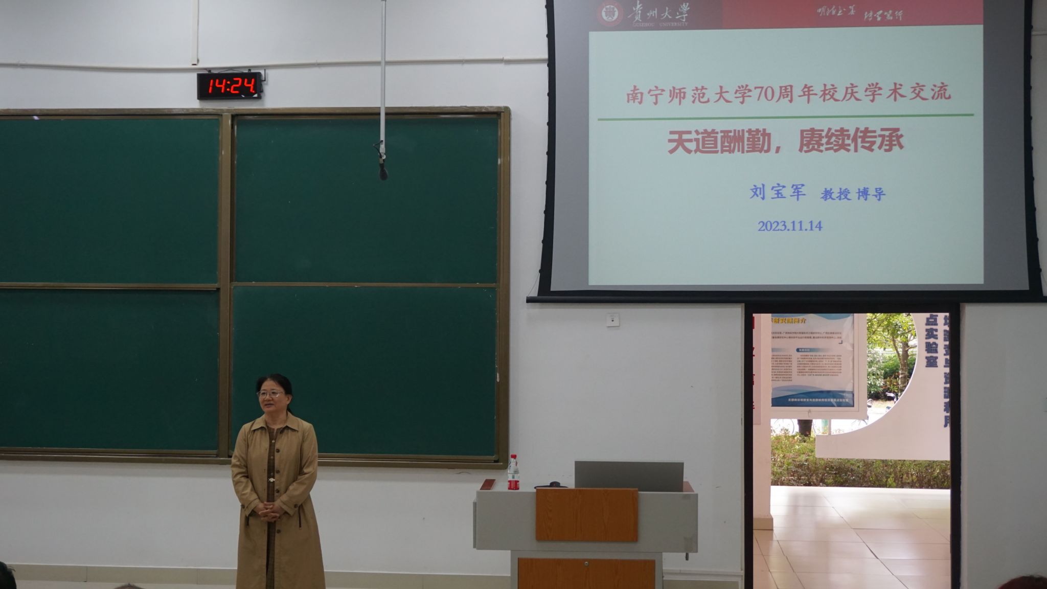 11月14日下午,贵州大学资源与环境工程学院教授、博士生导师刘宝军教授应邀于武鸣校区开展南宁师范大学“优秀校友进校园·通识教育系列讲座”活动,为必赢766net手机版师生做了一场题为《天道酬勤赓续传承》的学术讲座,讲座由必赢766net手机版院长宋书巧主持,王鑫宇、曲炳鹏、覃玲玲、吴柳杰等教师及学生共计230余人现场聆听了讲座。