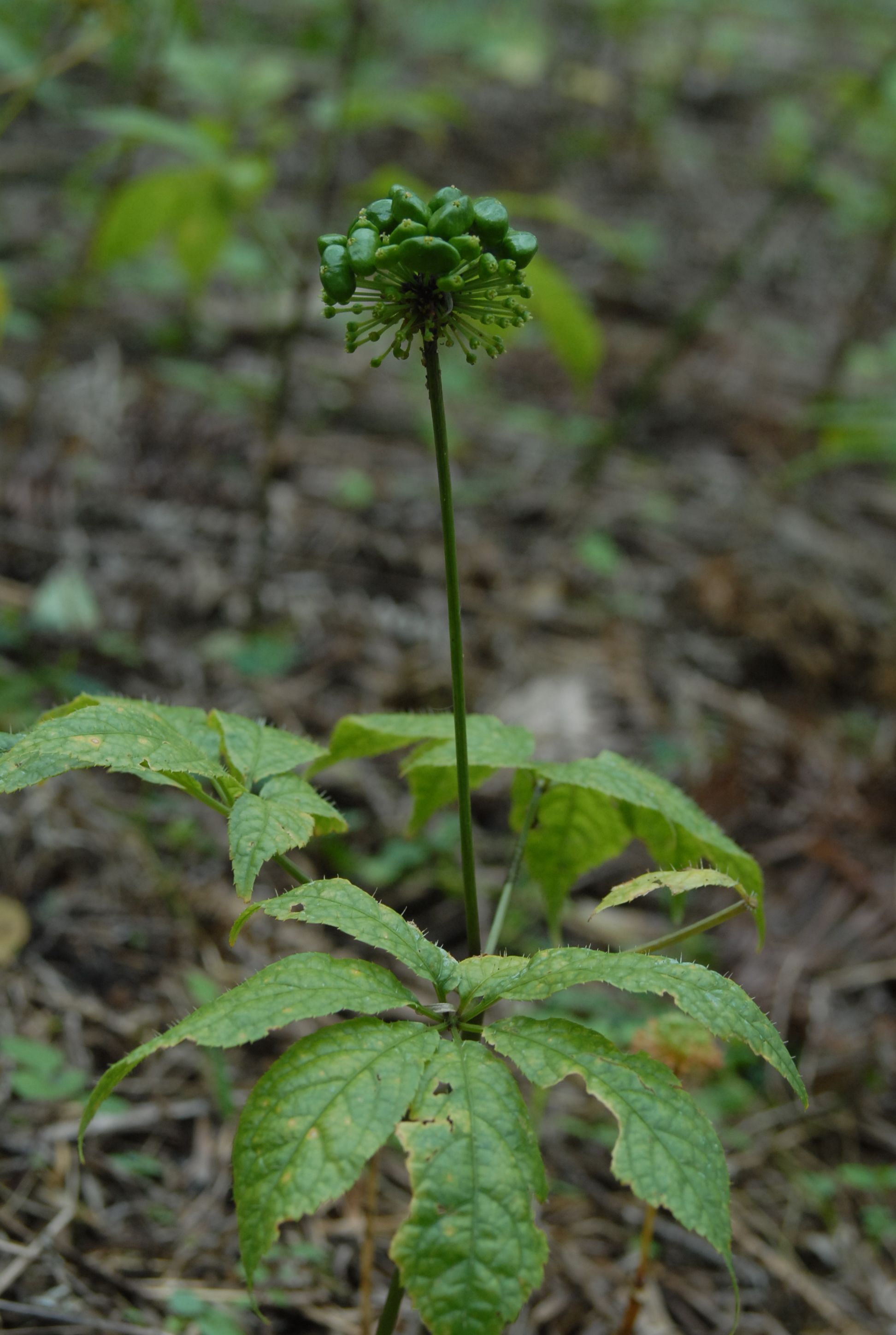 掌状复叶3-6轮生茎顶,叶柄长5-12厘米,无毛;小叶长椭圆形、倒卵形或倒卵状长椭圆形,长3.5-13厘米,先端渐尖,具重锯齿,齿尖具短尖头,两面沿脉疏被刺毛; |